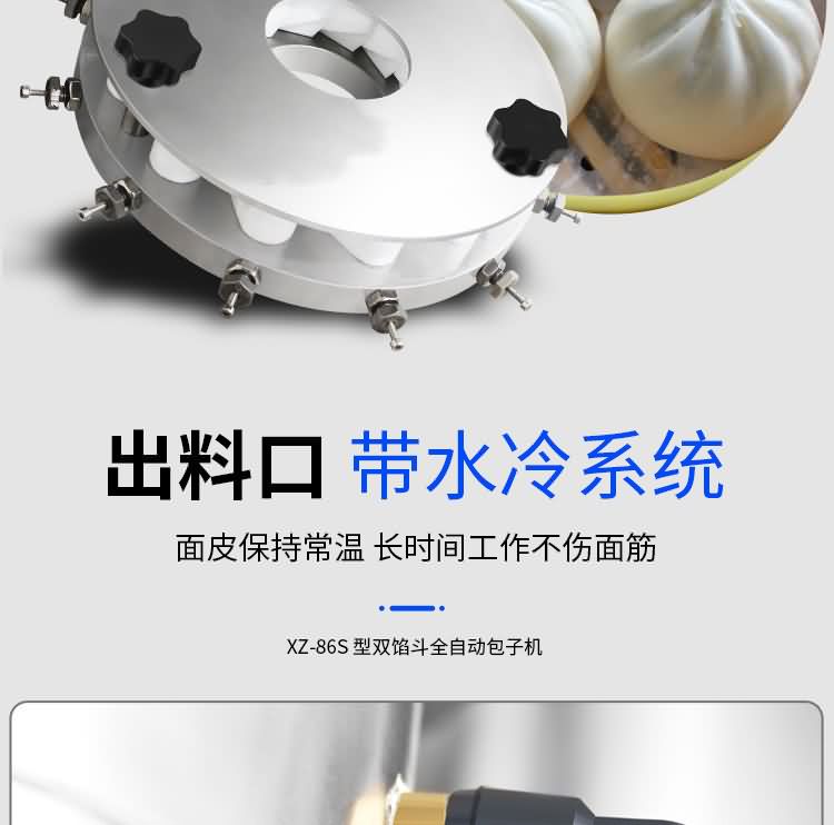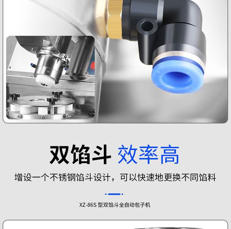 XZ-86S型雙餡斗全自動包子機是在XZ-86全自動包子機的基礎上,增設了一個不銹鋼餡斗設計,可以更快速地更換不同餡料,從而提高了工作效率,而且性能更穩定,使用壽命更長。