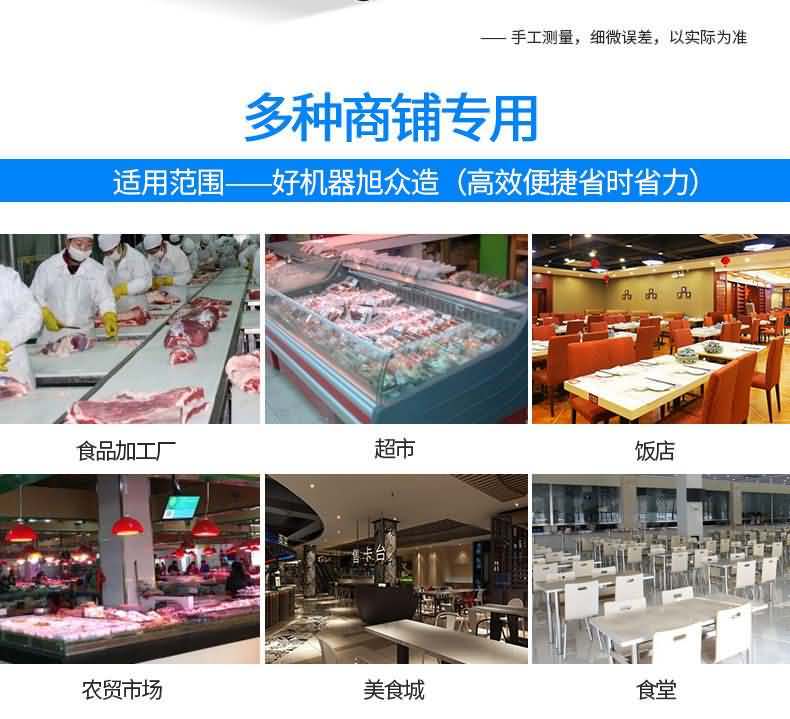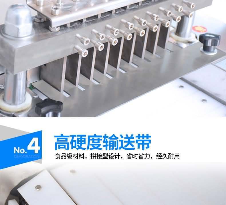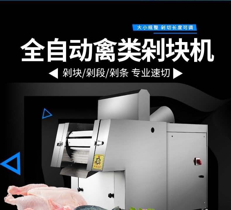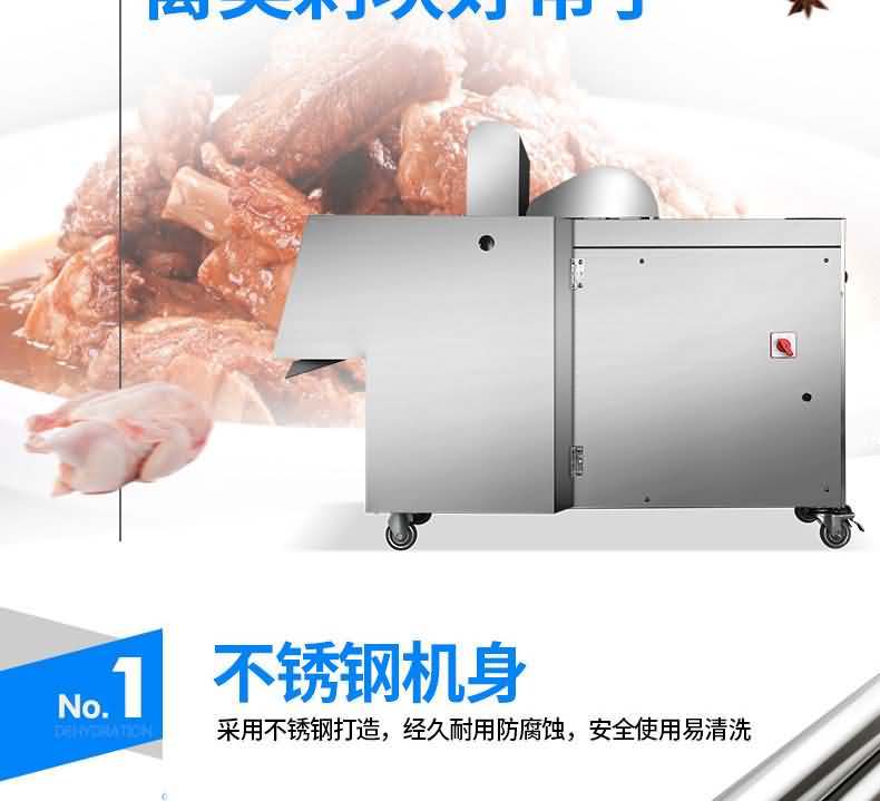 本機性價比高,模擬以手工切斷,切塊的原理采用“變速機構,自動送料”的結構研制而成。無損耗,采用特殊刀具刀塊,自動加厚履帶輸送,避免了切塊的危險性,使用安全性較高,切斷過程中不產生廢料,很大程度的保護了您的利益,節省人工,一機可抵多人工作,每小時可剁切600公斤,大大提高生產效率。廣泛用于大中小型食品加工廠、集體食堂、屠宰場、肉聯加工廠、超市等。適用于雞肉、鴨肉、魚,中小型動物骨頭、冷凍肉、鮮肉、凍雞、雞腿等帶骨肉類,可根據需要剁塊、段、條等,大小可調。