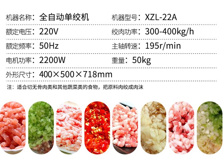 XZL-22A絞肉機吸取同行之優點,改進新型絞肉切肉機械,它能切豬肉、羊肉、牛肉、魚及其它各種肉類、所切肉片厚度適中切片效率高,是餐廳、賓館、酒樓、單位食堂等絞肉切肉的理想機械,該機外形獨特,操作方便,維修簡單,工作效率高,在同行業中處領先地位,與食物接觸部分均采用不銹鋼制造符合食品衛生標準。