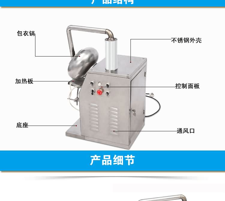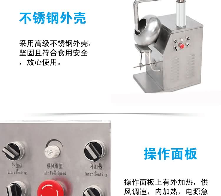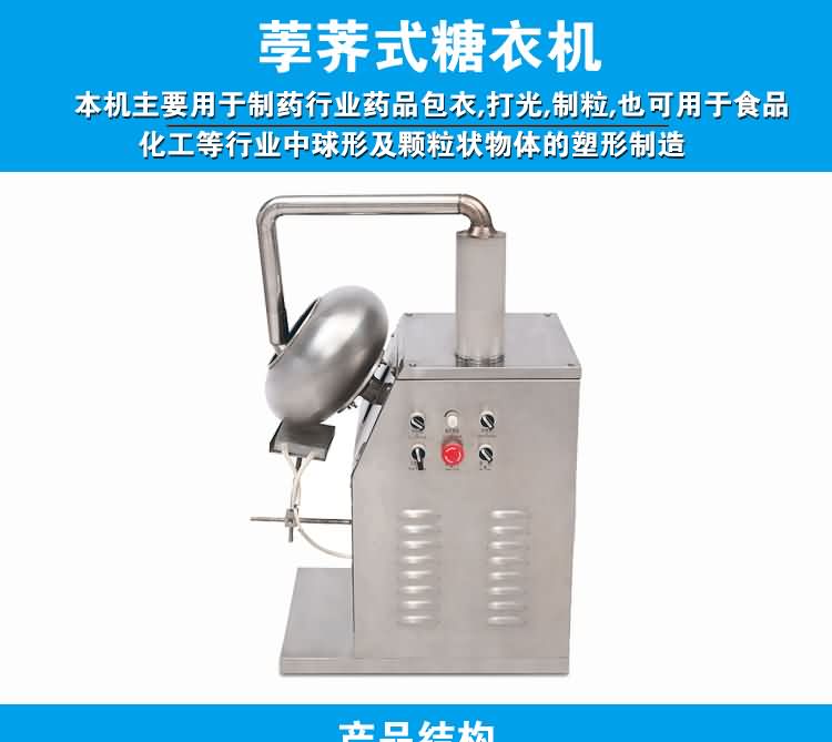 本機是供制藥工業(yè)中將成型的芯片進行均勻地外層包衣及拋光的機械。亦可用于食品工業(yè)中糖果機制丸或包衣。