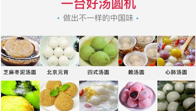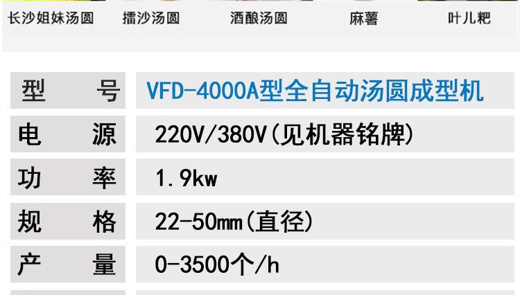 VFD-4000A型全自動(dòng)湯圓成型機(jī),功能齊全,適用性廣,自動(dòng)化程度高,定量準(zhǔn)確,操作簡(jiǎn)單,只要將面團(tuán)與餡料放入進(jìn)料口,開(kāi)機(jī)便可自動(dòng)搓圓、成型,制品不易變形。
