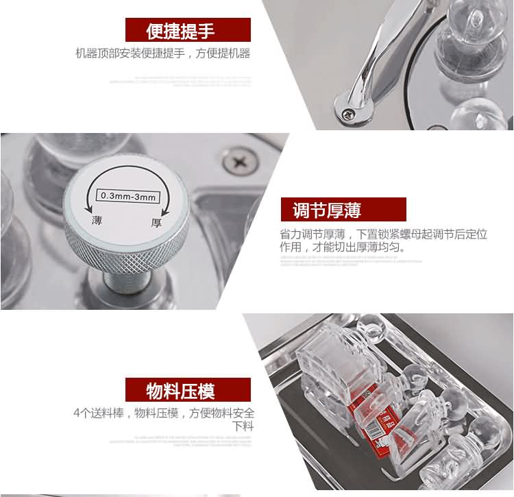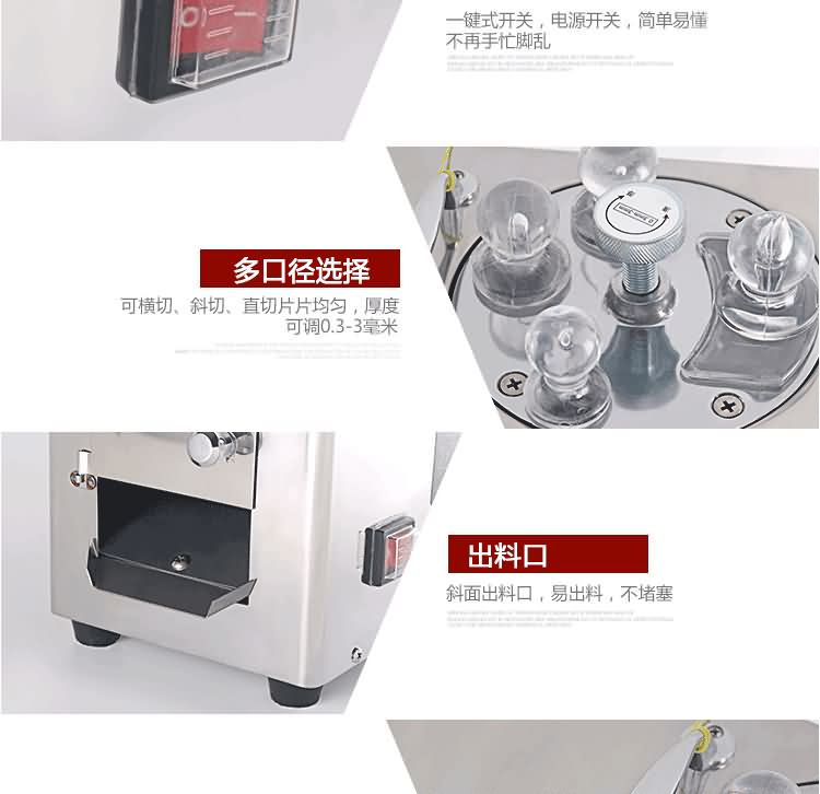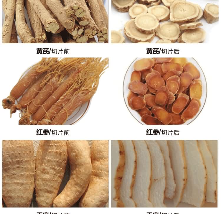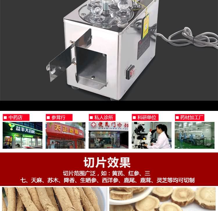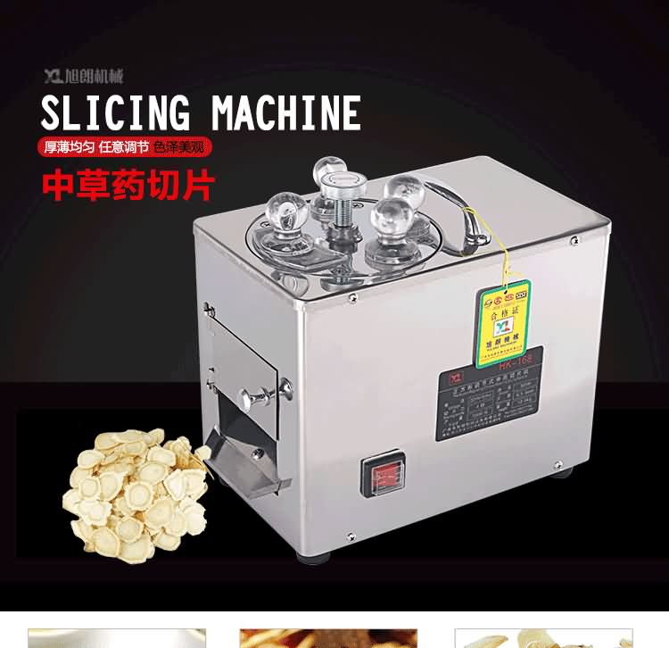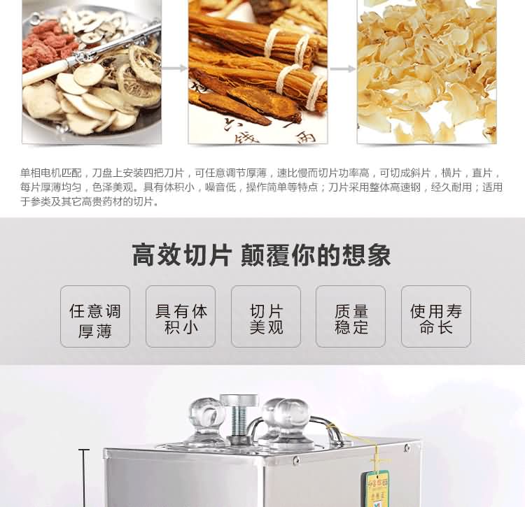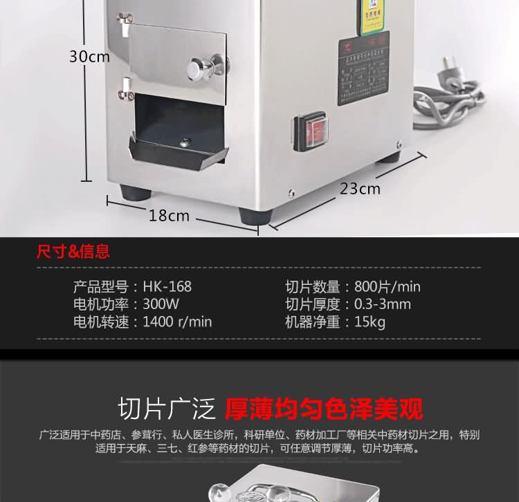 HK-168參茸切片機單相電機匹配,刀盤上安裝四把刀片,可任意調節厚薄,速比慢而切片功率高,可切成斜片,橫片,直片,每片厚薄均勻,色澤美觀。具有體積小,噪音低,操作簡單等特點;刀片采用整體高速鋼,經久耐用;適用于參類及其它高貴藥材的切片。