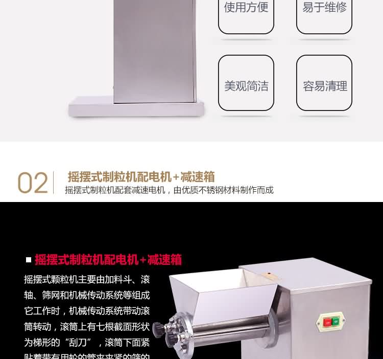 搖擺式顆粒機可將混合的粉末狀物制成顆粒,也可將塊狀的干料粉碎成所需的顆粒。搖擺式顆粒機適用于制藥廠、化工廠、食品廠、科研單位、實驗室、醫院、保健品廠批量生產。搖擺式顆粒機整機全部采用優質不銹鋼制造,符合GMP標準。